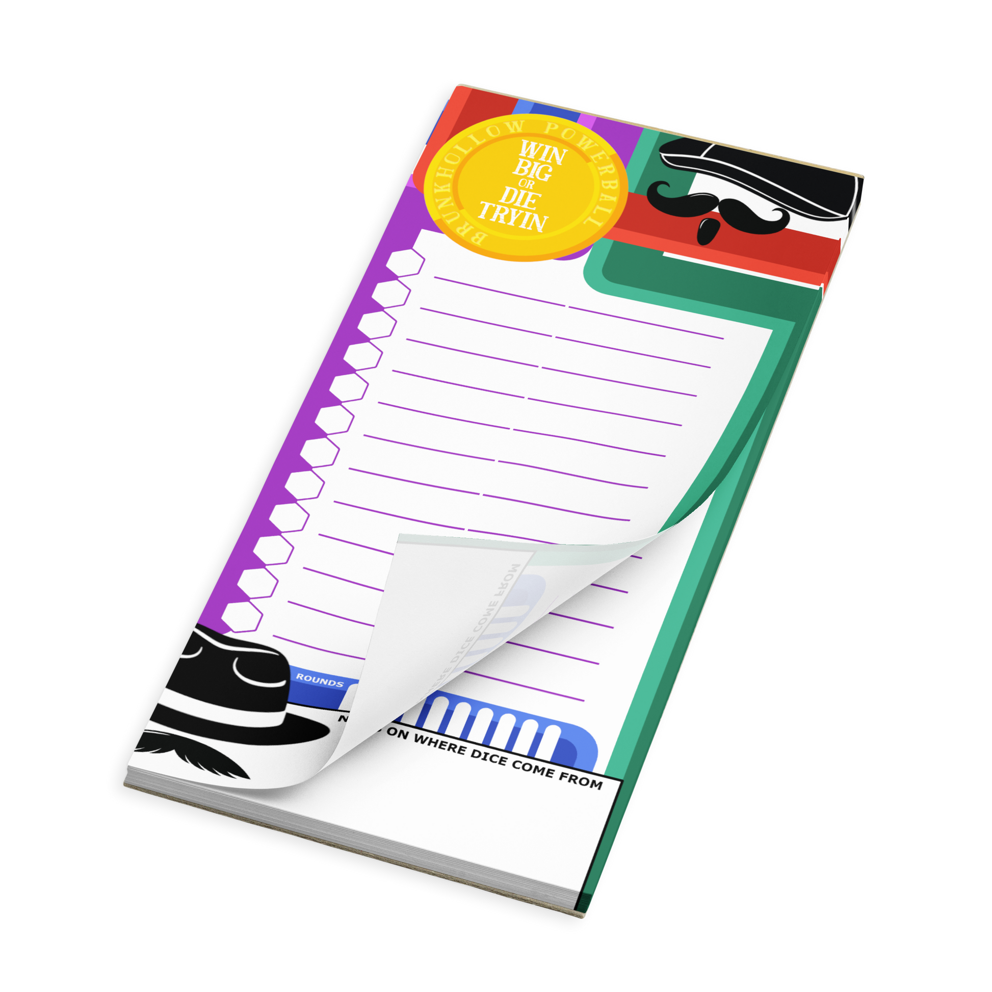 Presenting the Brunkhollow Powerball Initiative Tracker, where red, blue, purple, and green can get ya begging for a higher dexterity modifier! This tracker notepad has 12 initiative slots for noting the character's name and any notes that go along with them. There is also a "rounds of combat" tracker, so you can tell that forgetful wizard of yours that their Slow spell has indeed run its full duration and it's time for them to run.